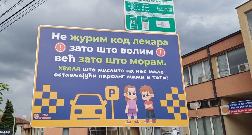 Конкретно, на потезу испред Школског диспанзера постављена је табла која упућује на важност чувања паркинг места намењених родитељима који доводе болесну децу, а која се често користе за друге сврхе.