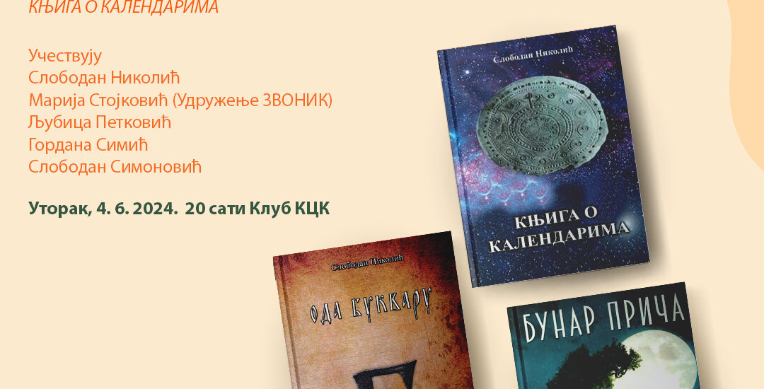 U utorak 4.6.2024. u Klubu KCK održaće se predstavljanje knjiga Slobodana Nikolića: -“Bunar priča” -“Oda bukvaru” -“Knjiga o kalendarima”.