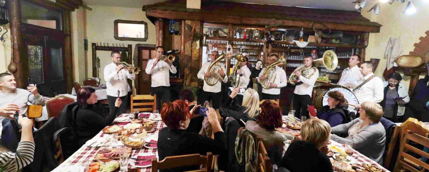 домаћим пићем: ракија, вино, сокови од малине…) уз народну музику Дувачког оркестра