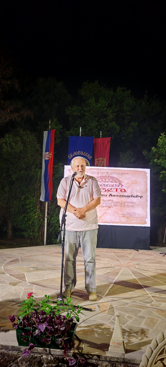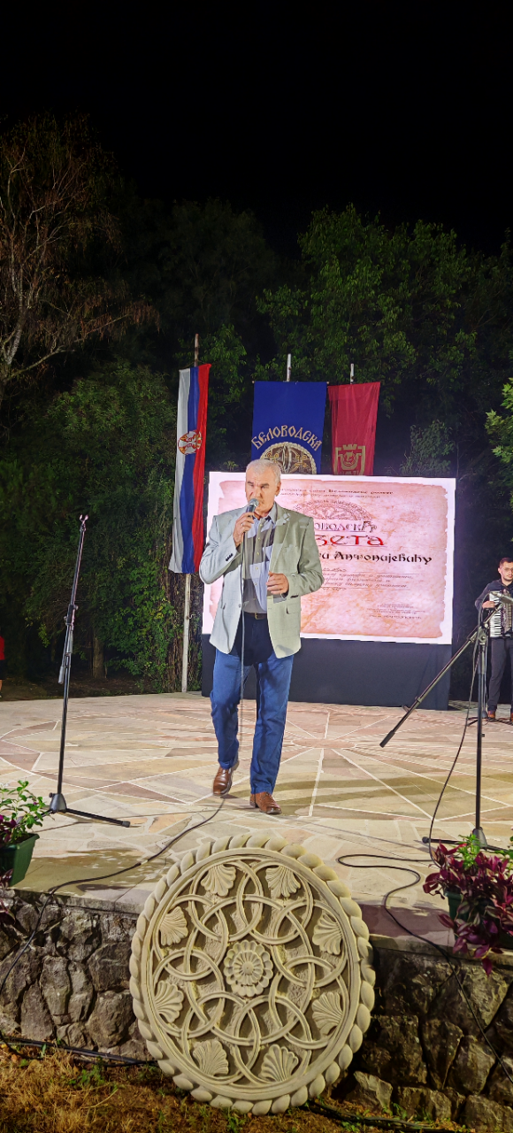 Осим речи захвалности, публици се обратио са посебном поруком: „Овај камен процветали треба да црта док је света и века, док је Срба и српскога рода јер је у том камену исклесан и наш дух, наша прошлост и наша будућност. Уметност је ту да успавани камен пробуди. Тако треба и наше српство да се буди, треба једни друге да гледамо, да се не делимо, да вечно трајемо, као и наш српски род“.