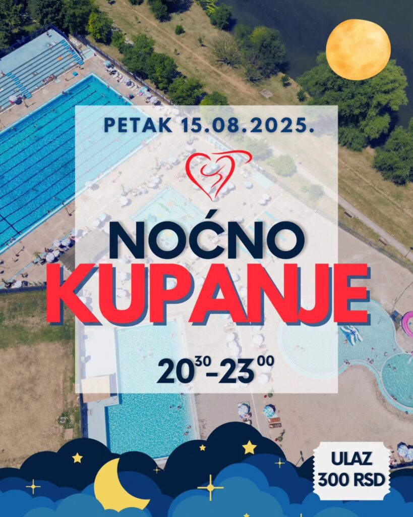 Овог петка, 15. августа, не пропустите прилику за освежење на базенима Спортског центра у Трстенику. Ноћно купање је омогућено у термину од 20:30 до 23 часа, а улаз је 300 динара по особи.